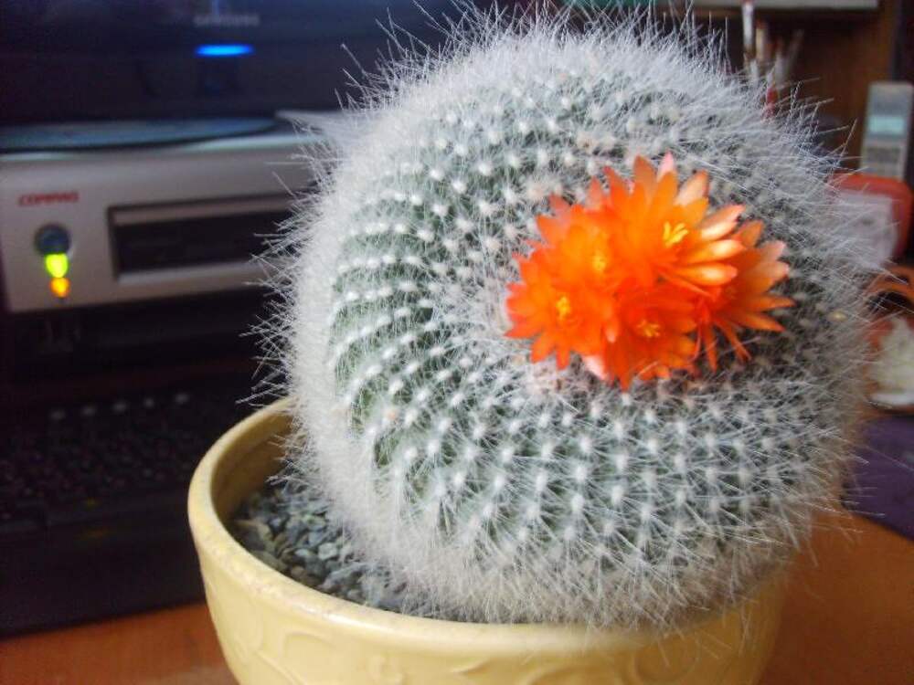 Стебель этого кактуса шаровидный, приплюснут на макушке, ребристый. Ребер много, они низкие, разделены на спирально расположенные бугорки. Ребер, как правило, не видно, поскольку стебель густо укрыт тонкими, растущими в разных направлениях колючками, как бы окутан плотной колючей сеткой. Цветки... Далее