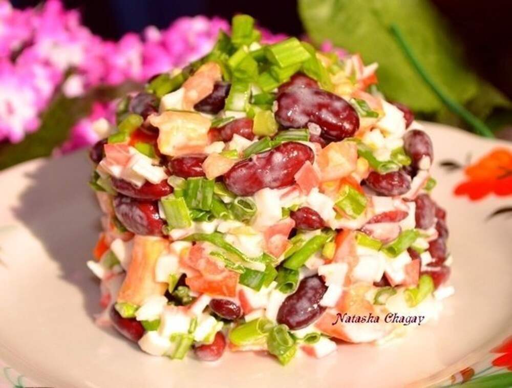 Ингредиенты: -Фасоль красная в собственном соку 1 банка -краб палочки 100 гр -помидоры 2 шт -зелень любая 1 пучок -чеснок по вкусу -майонез -соль и перец черный молотый по вкусу. Порезать мелко крабовые палочки. С фасоли слить жидкость. Порезать небольшими кусочками помидоры.... Далее